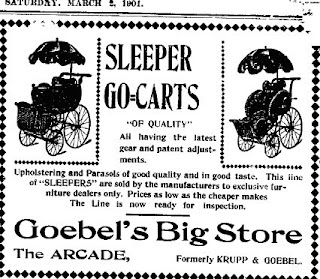 A newspaper advertisement from the March 2, 1901 issue of the Sandusky Daily Star features a Sleep Go-Cart from Goebel’s Big Store. The product is upholstered, and contains a parasol to protect baby from the sun.