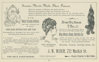 Weier’s Cream of Roses was used for healing cuts and burns. Weier’s Circassian Pearl was recommended for freckles and tan. Weier’s Reliable Hair Renewer was used to remove gray from hair, and Weier’s German Hair Vigor was supposed to positively stop hair from falling out. Mr. Weier also sold wigs, waves, bangs and switches.